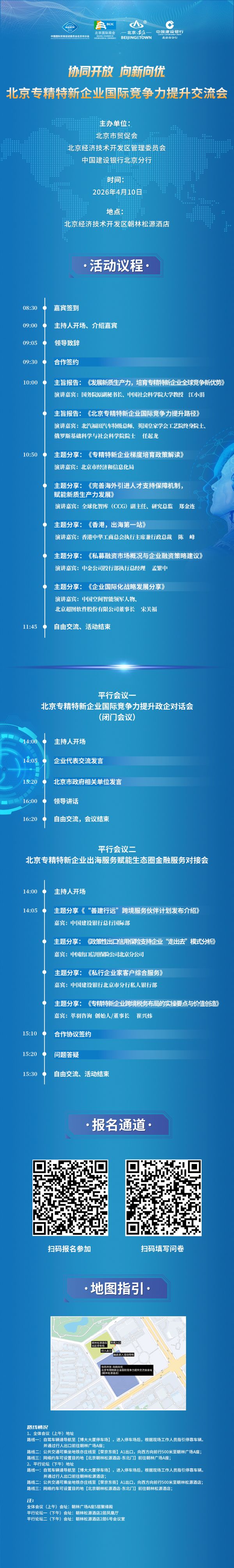 为深化北京专精特新企业国际化发展布局,切实助力企业提升国际竞争力、精准对接全球市场资源,由北京市贸促会、北京经济技术开发区管理委员会、中国建设银行北京市分行共同主办的北京专精特新企业国际竞争力提升交流会,定于2026年4月10日在北京经开区朝林松源酒店(北京经开区荣华中路19号)举行。