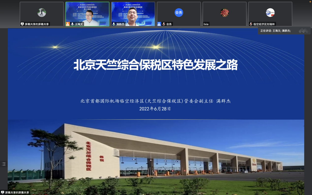 6月29日下午,我会、北京服务贸易协会、北京第二外国语学院经济学院共同举办了助力国际化人才培养系列活动——“走进北京天竺综合保税区”线上讲座。首都国际机场临空经济区(北京天竺综合保税区)管委会副主任满群杰、中国保税区出口加工区协会秘书长席艳荣及毕马威中国政府及公共服务部门的代表应邀到会,围绕“天竺综合保税区特色发展之路”、“我国综保区发展建设情况以及对构建新发展格局的战略意义”及“我国自贸试验区发展情况以及对国际化人才的需求”与大家进行了分享。