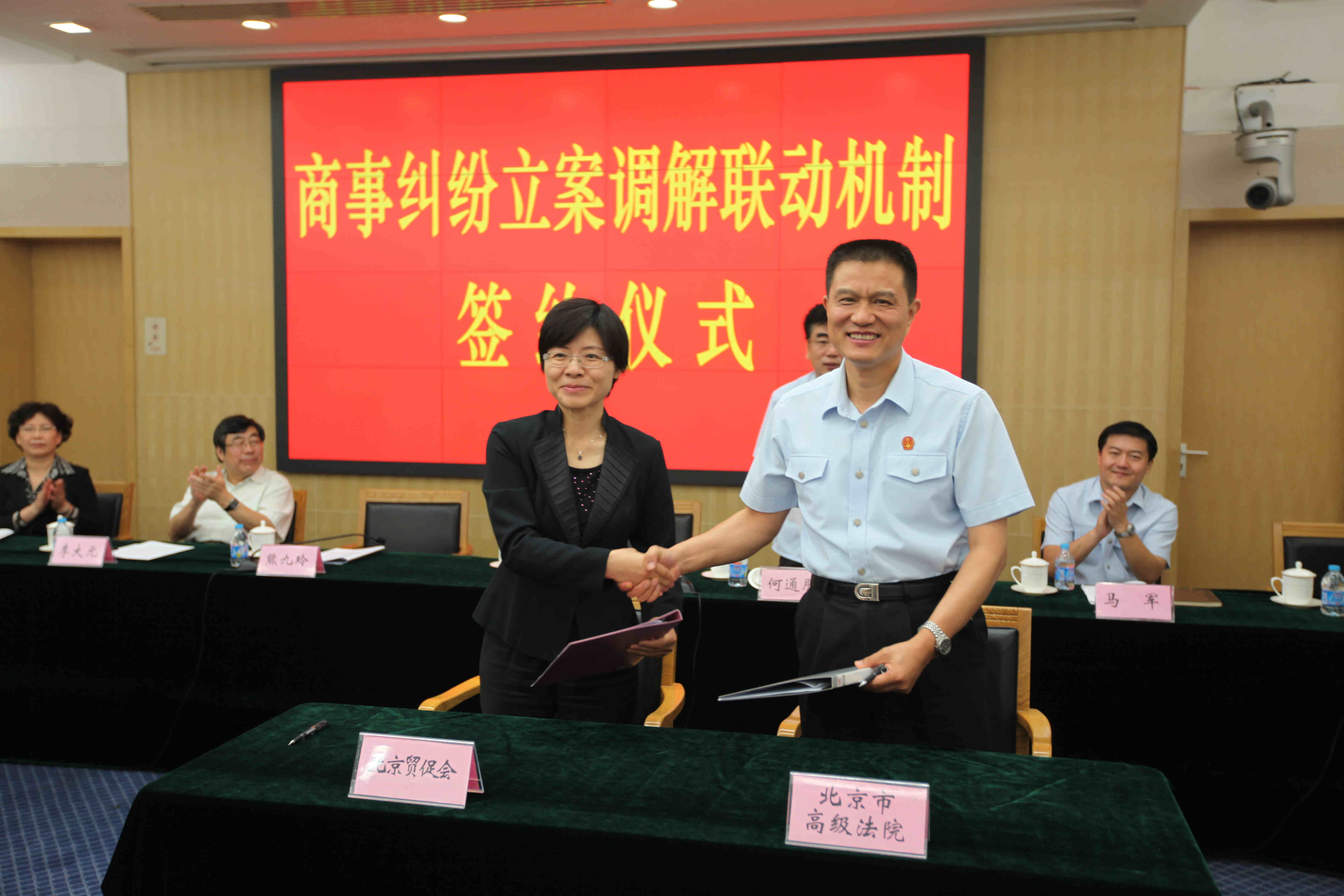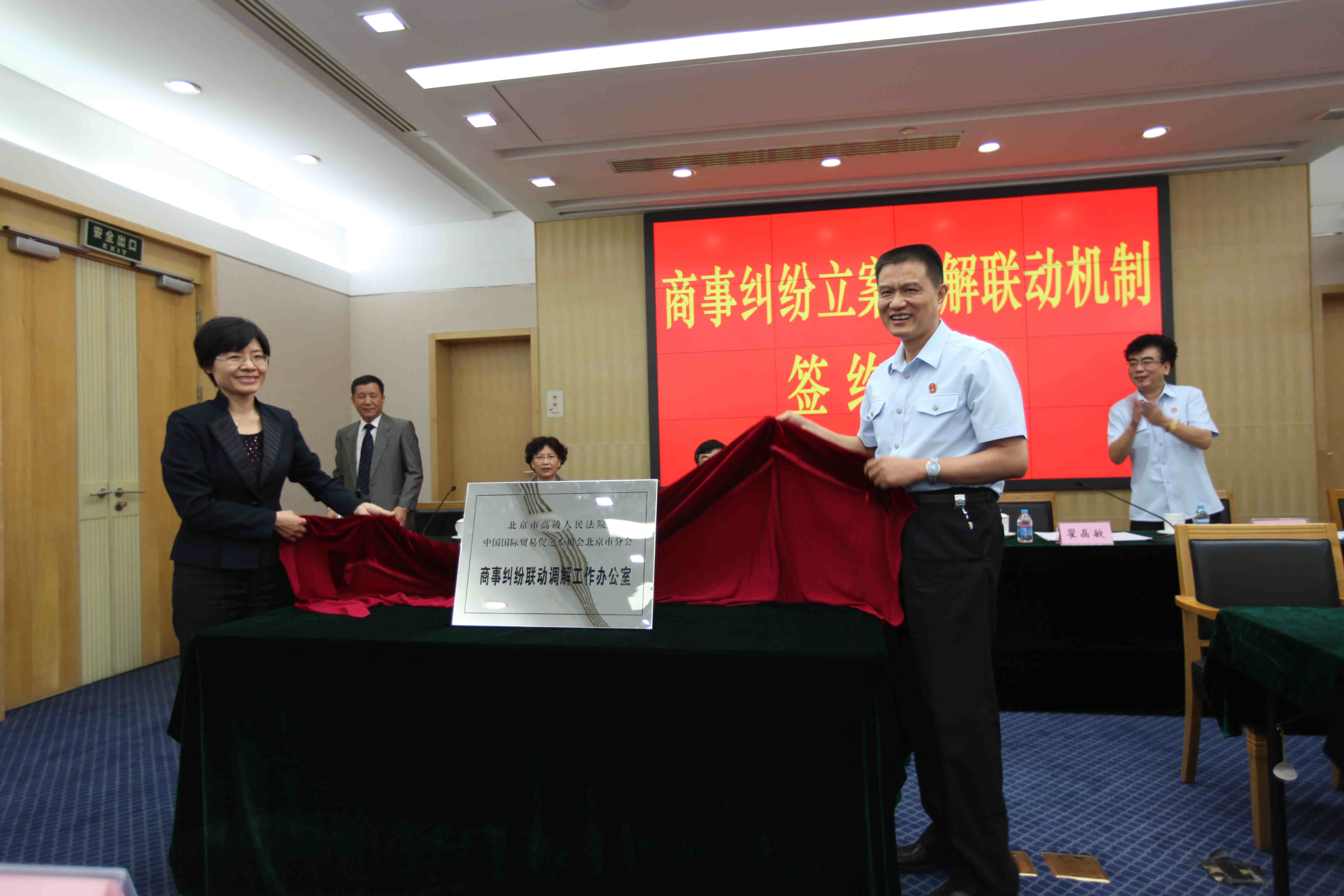 为建立多元化纠纷解决机制,探索诉讼与非诉讼相衔接解决商事纠纷的合作模式,充分发挥贸促系统商事调解组织专业化、国际化的优势,根据中央十六部委《关于深入推进矛盾纠纷大调解工作的指导意见》的通知精神和中国贸促会《关于进一步健全全贸促会法律服务工作机制的指导意见》的要求,我会与北京市高级人民法院于9月25日上午举行了建立商事纠纷立案调解联动机制合作、商事纠纷联动调解工作办公室的签字和揭牌仪式。