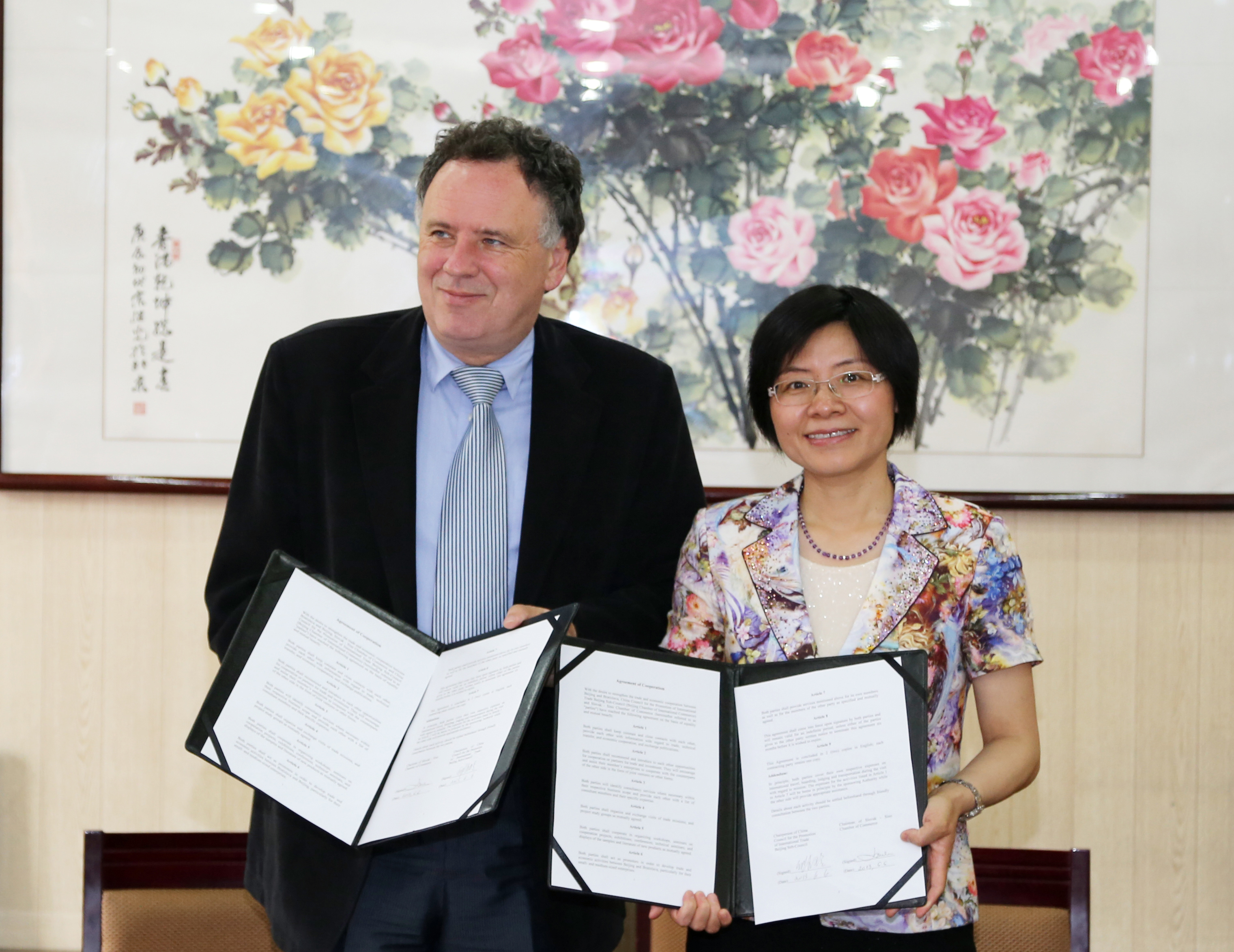 6月6日上午,熊九玲主任会见了斯洛伐克-中国商会会长皮特•保伦(曾任斯洛伐克驻华大使)、斯洛伐克驻华大使馆商务参赞弗拉基米尔•普里斯塔什一行。双方签署了友好合作协议,同意在经贸团组互访、投资贸易洽谈、会议展览活动等方面加强合作。