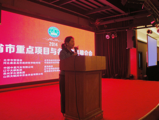 推介会上,部分省市领导、驻京联络处主任、企业家推介了重点项目和名优产品。其中来宾市政府驻京联络处主任莫晓燕、秦皇岛市政府驻京联络处主任张巨良、秦皇岛市海港区常务副区长齐香民、中国文化研究会副秘书长任梓涵、中国企业投融资中心执行主任李延平、中国中星汽车有限公司执行董事刘明、洛阳大唐官窑瓷业有限公司董事长宋胜利、辽宁天麒集团公司董事长张志辉、山西天赋润丰农业开发有限公司董事长段平安、富海集团总裁助理赵远峰、辽宁金伟连净水设备公司总经理马志权、吉林芝所以生物科技有限公司总经理冯琦、吉林省森宝参花香集团董事长丁政然、北京航天常兴科技发展有限公司销售经理郭丽娟等介绍了项目。